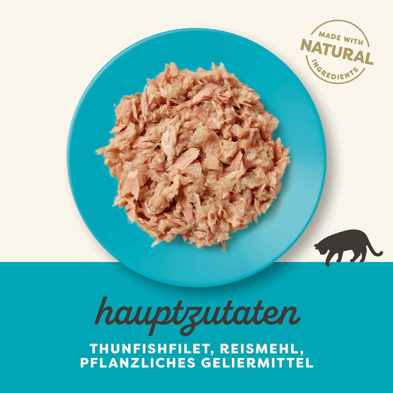 Aliment complémentaire pour tous les chats, riche en viande, sans céréales ni gluten, à base d'ingrédients naturels, dans une savoureuse gelée, sans additifs artificiels.